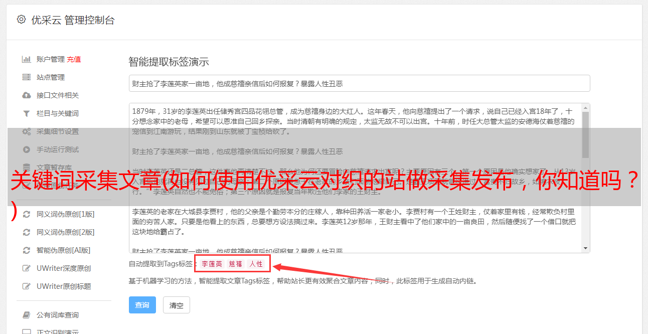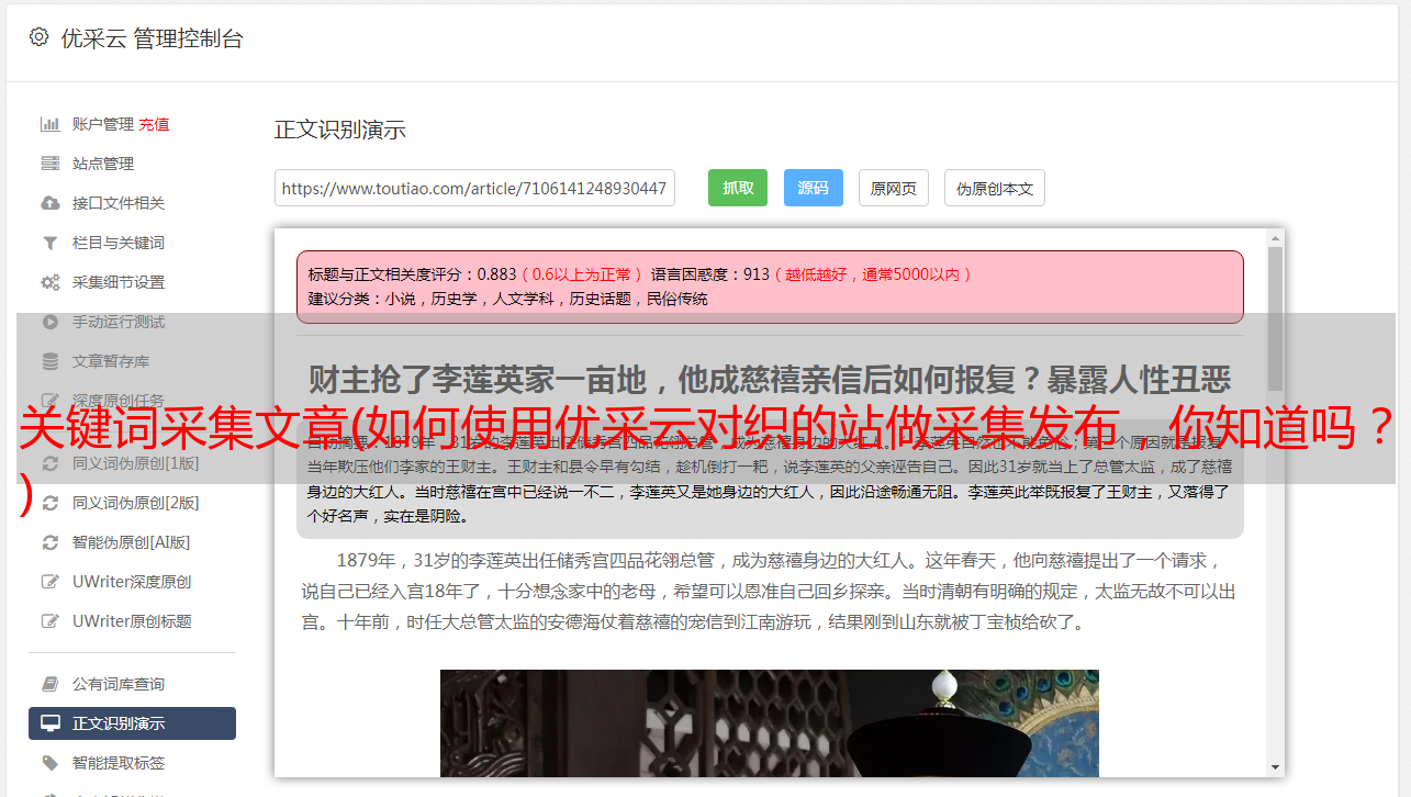 织梦优采云采集几十万个不同的cms网站可以统一管理。一个人维护数百个 网站文章 更新也不是问题。围绕已识别的 关键词 进行内容优化。关键词的搜索量高低,都离不开内容的优化,尤其是围绕关键词编写优质内容更能吸引目标用户。织梦优采云采集为了让搜索引擎收录你的网站,织梦优采云采集我们可以还设置自动下载图像和替换链接。它也可以给搜索引擎一个好印象。因此,企业需要根据优化后的关键词编写相关内容并保持定期更新,
