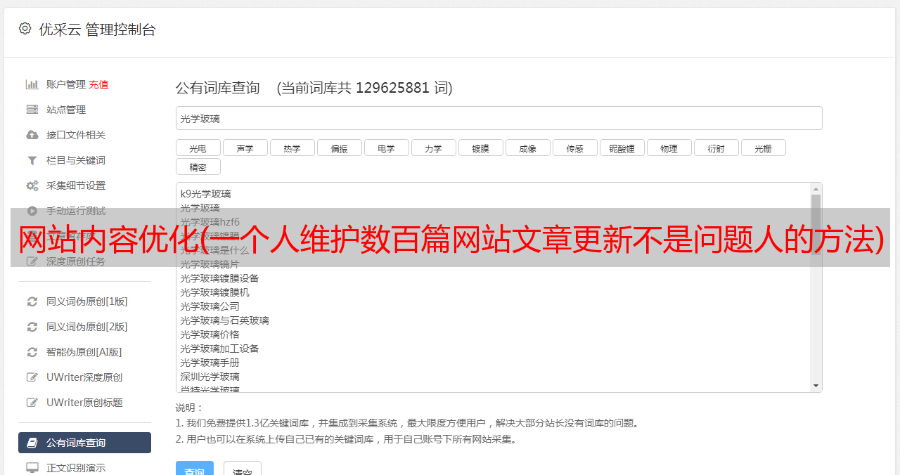 优采云 发布时间: 2022-03-27 05:22网站内容优化(一个人维护数百篇网站文章更新不是问题人的方法)