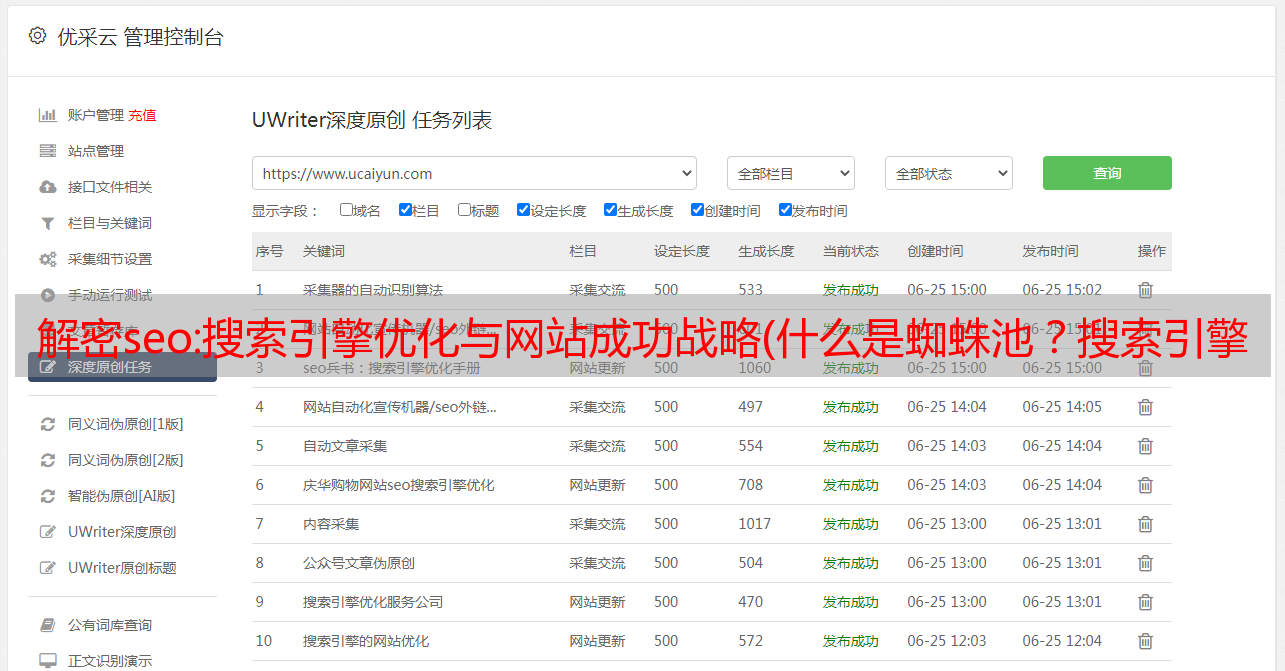 优采云 发布时间: 2022-03-27 06:03解密seo:搜索引擎优化与网站成功战略(什么是蜘蛛池?搜索引擎霸屏如何实现?要实现?)