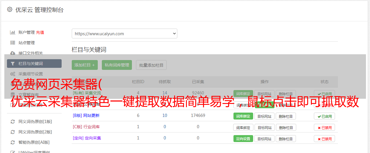 优采云采集器是一款高效的网页信息采集软件,一键采集网页数据,无论是静态网页还是动态网页采集,支持99%网站的网站,内置大量网站采集模板,覆盖多个行业,可保存为Excel表格,api提取成功后的数据库文件。