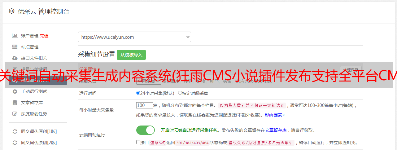 Raincms小说插件支持市面上大部分cms,一键伪原创,关键词和图片随机插入。所有功能一键完成,无需掌握复杂的配置规则。