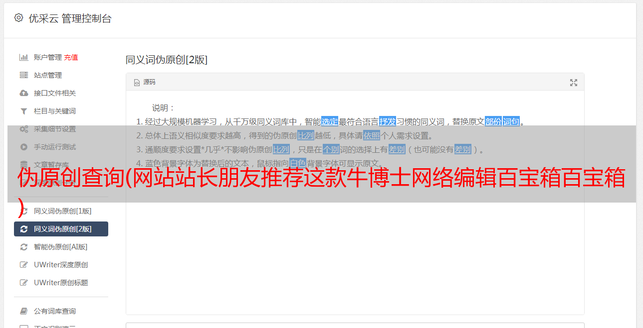 优采云 发布时间: 2022-03-27 11:11伪原创查询(网站站长朋友推荐这款牛博士网络编辑百宝箱百宝箱