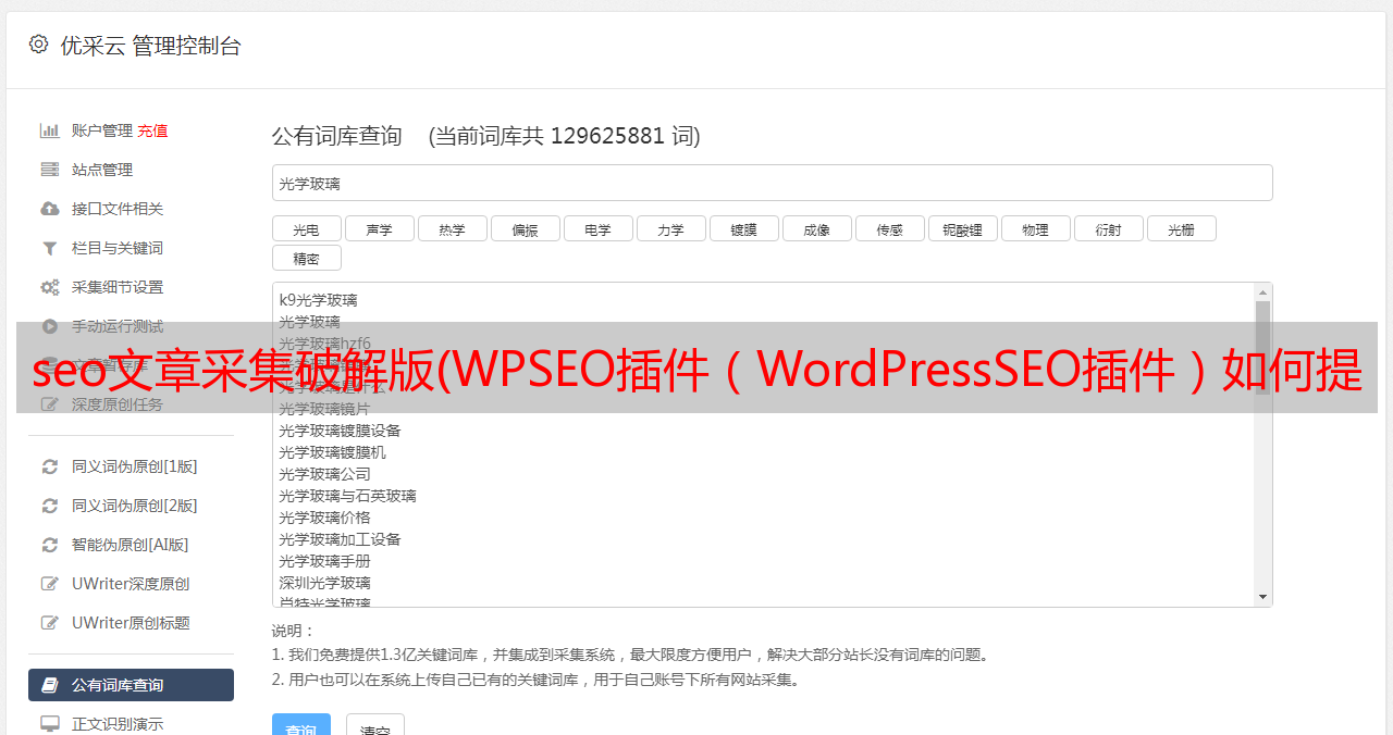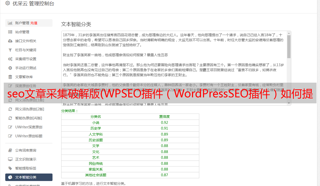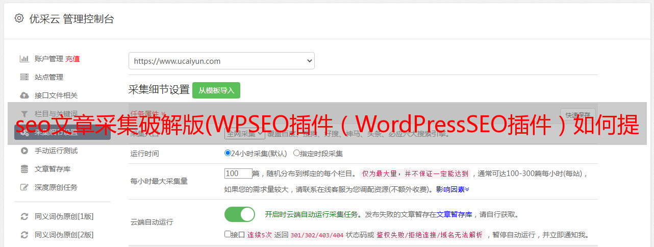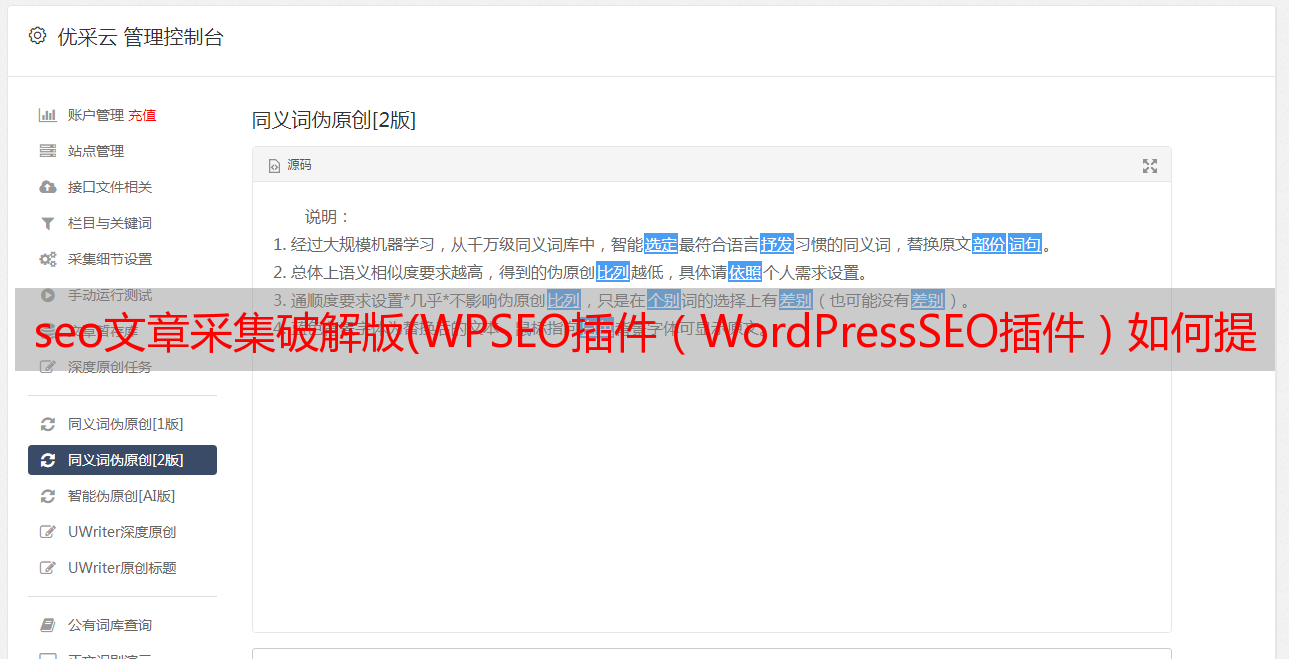 WPSEO 插件文章内容管理方面可以完全自动化文章通过我们的采集伪原创发布。通过成熟的自然语言处理系统,我们可以打造属于自己的优质原创文章,帮助我们维护网站日常运维。WPSEO 插件可以帮助我们正确添加 SEO 标题、TDK 等,生成 XML 站点地图,将我们的 网站 新 URL 推送到搜索引擎,优化社交媒体等等。