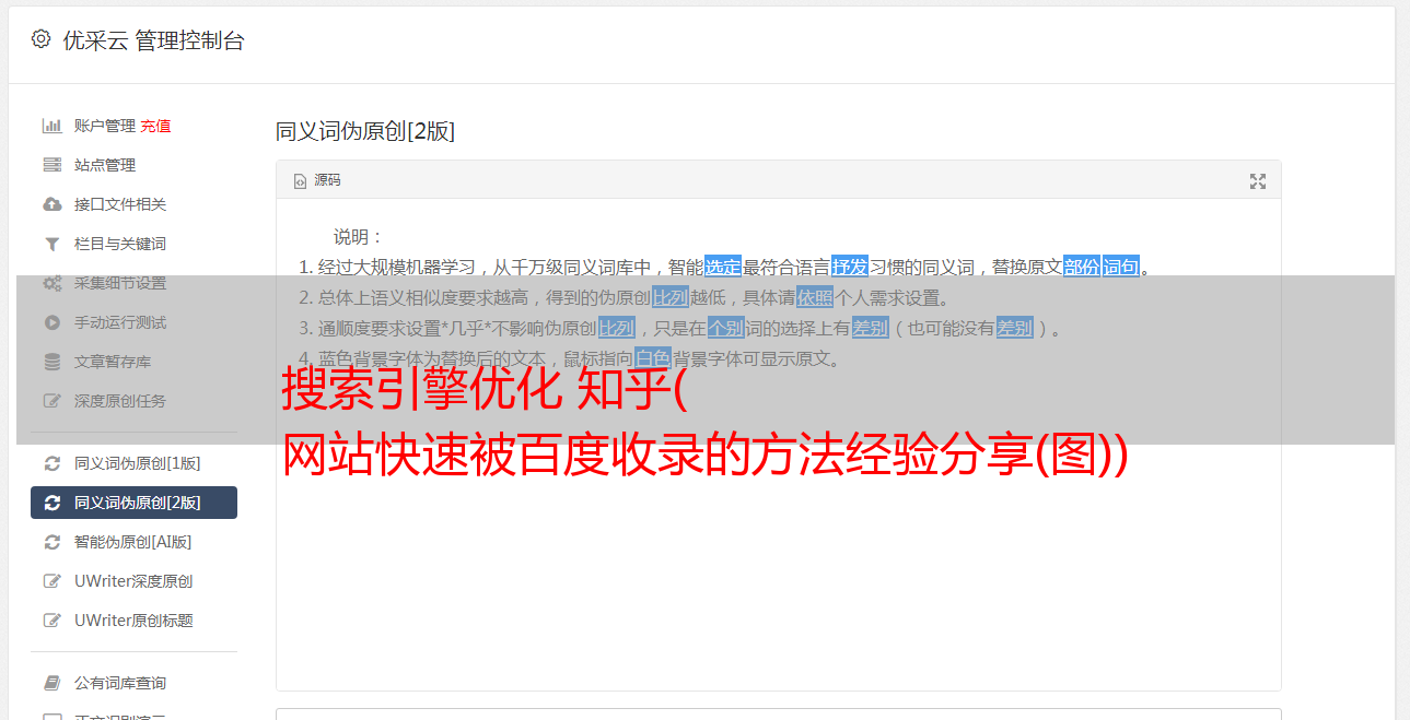 一定要使用白帽SEO优化技术,不要投机取巧。定期更新一些原创内容,同时为用户带来有价值的信息,是网站长期的发展规划。内容为王的道理是不变的,原创内容是搜索引擎最关心的。如果原创内容不多,而你采集丰富文章在线,一定要做伪原创。您可以使用在线智能AI伪原创批量伪原创,为您的网站创作更多优质内容,还支持在各大cms平台发布。
