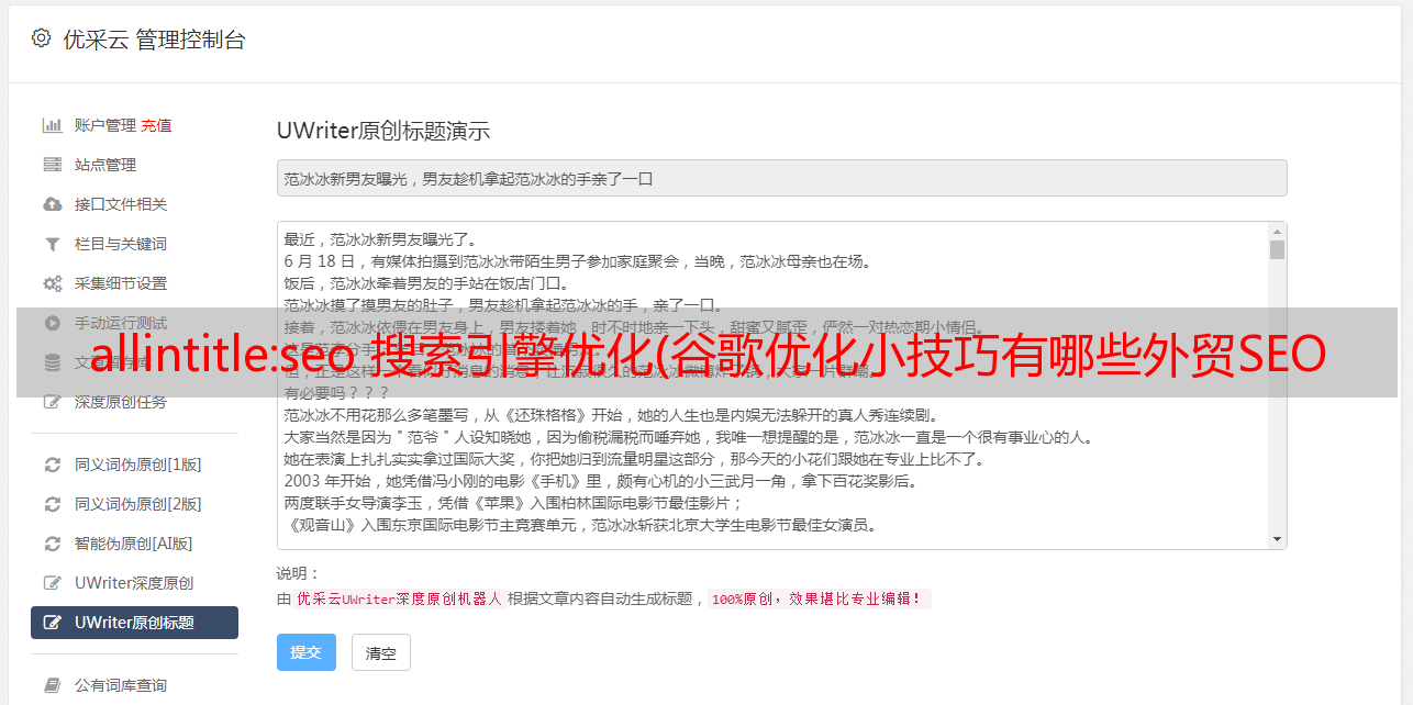 优采云 发布时间: 2022-04-02 03:07allintitle:seo 搜索引擎优化(谷歌优化小技巧有哪些外贸SEO网站都认外贸企业站)