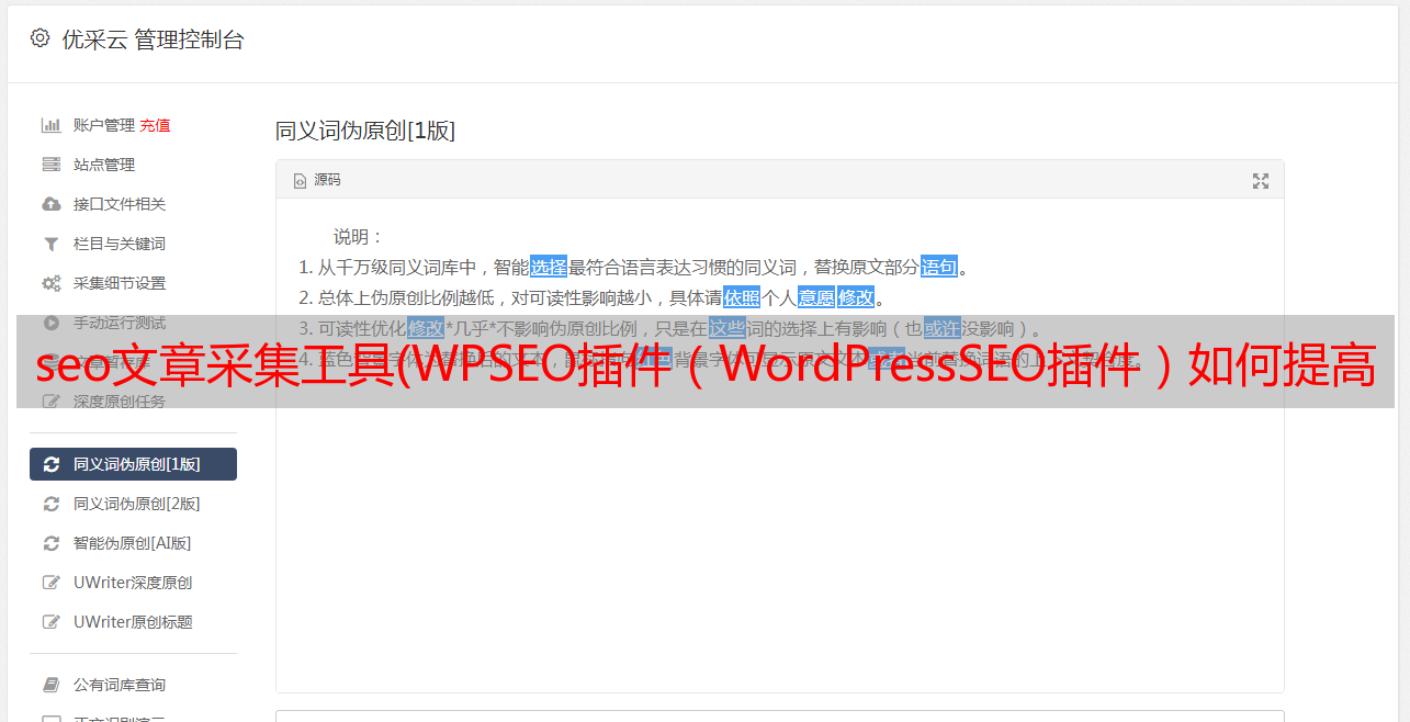 WPSEO 插件文章内容管理方面可以完全自动化文章通过我们的采集伪原创发布。通过成熟的自然语言处理系统,我们可以打造属于自己的优质原创文章,帮助我们维护网站日常运维。WPSEO 插件帮助我们正确添加 SEO 标题、TDK 等,生成 XML 站点地图,将我们的 网站 新 URL 推送到搜索引擎,优化社交媒体等等。