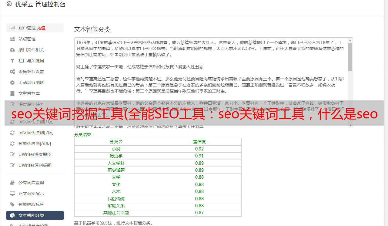 seo关键词工具,什么是seo关键词工具?它是由 采集 批量扩展的 关键词。根据相关搜索,大量用户搜索的词称为SEO关键词。做好关键词,可以获得一定的流量。今天给大家分享一款全能的SEO工具:自动采集+伪原创(图片视频伪原创)+各大发布cms或自媒体平台+主动推送 给搜索引擎+seo点击功能(详情如图)