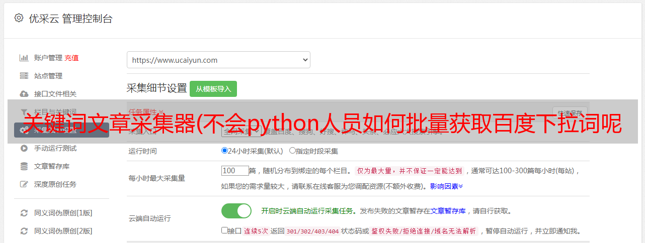 优采云 发布时间: 2022-04-03 13:03关键词文章采集器(不会python人员如何批量获取百度下拉词呢?技能干货)