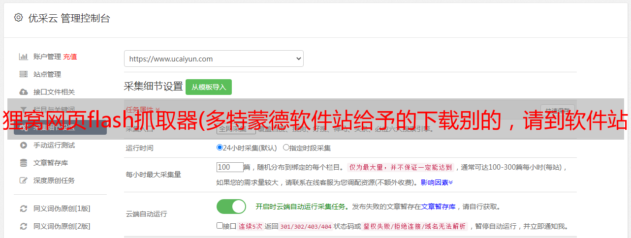 网页FLASH爬虫可以轻松大批量抓取网页中的flash,无需安装、注册、垃圾文档。{zhandian}流行推荐你下载网页FLASH抓取器,我一键破解,你可以放心使用。如果必须,何不下载并试一试!我在等你!