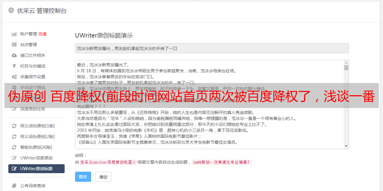优采云 发布时间: 2022-04-07 09:32伪原创 百度降权(前段时间网站首页两次被百度降权了,浅谈一番的表现)