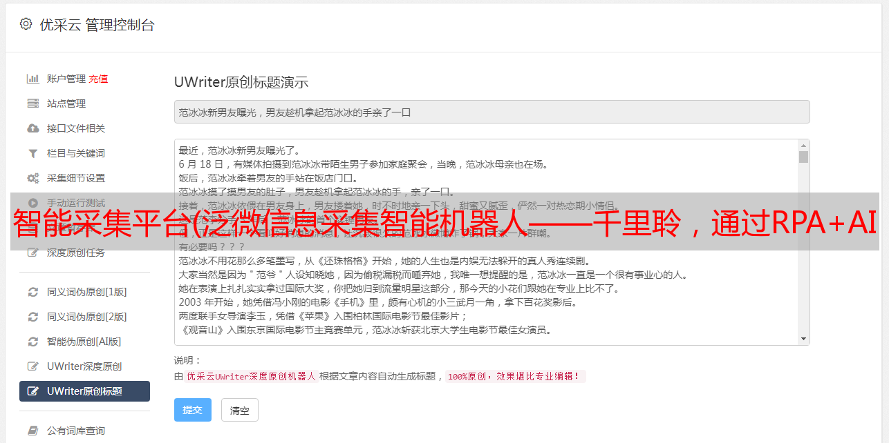 优采云 发布时间: 2022-04-10 09:03智能采集平台(泛微信息采集智能机器人——千里聆,通过RPA+AI两大系统引擎能力