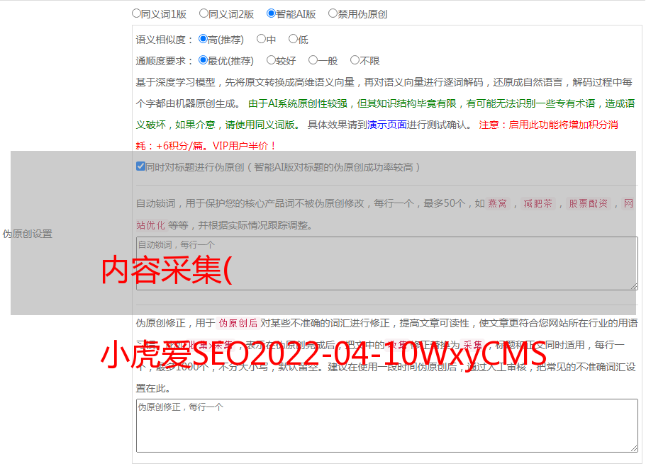 Wxycms 插件拥有非常强大的 NLP 自然语言处理系统。通过领先的技术,我们的伪原创文章可以在保持原创花费的同时保持良好的可读性。通过我们的段落文章插入、相关词替换、删除敏感字段(比如我们可以删除带有作者、出处等敏感信息的段落),让我们的文章与我们的 网站 主题更相关。