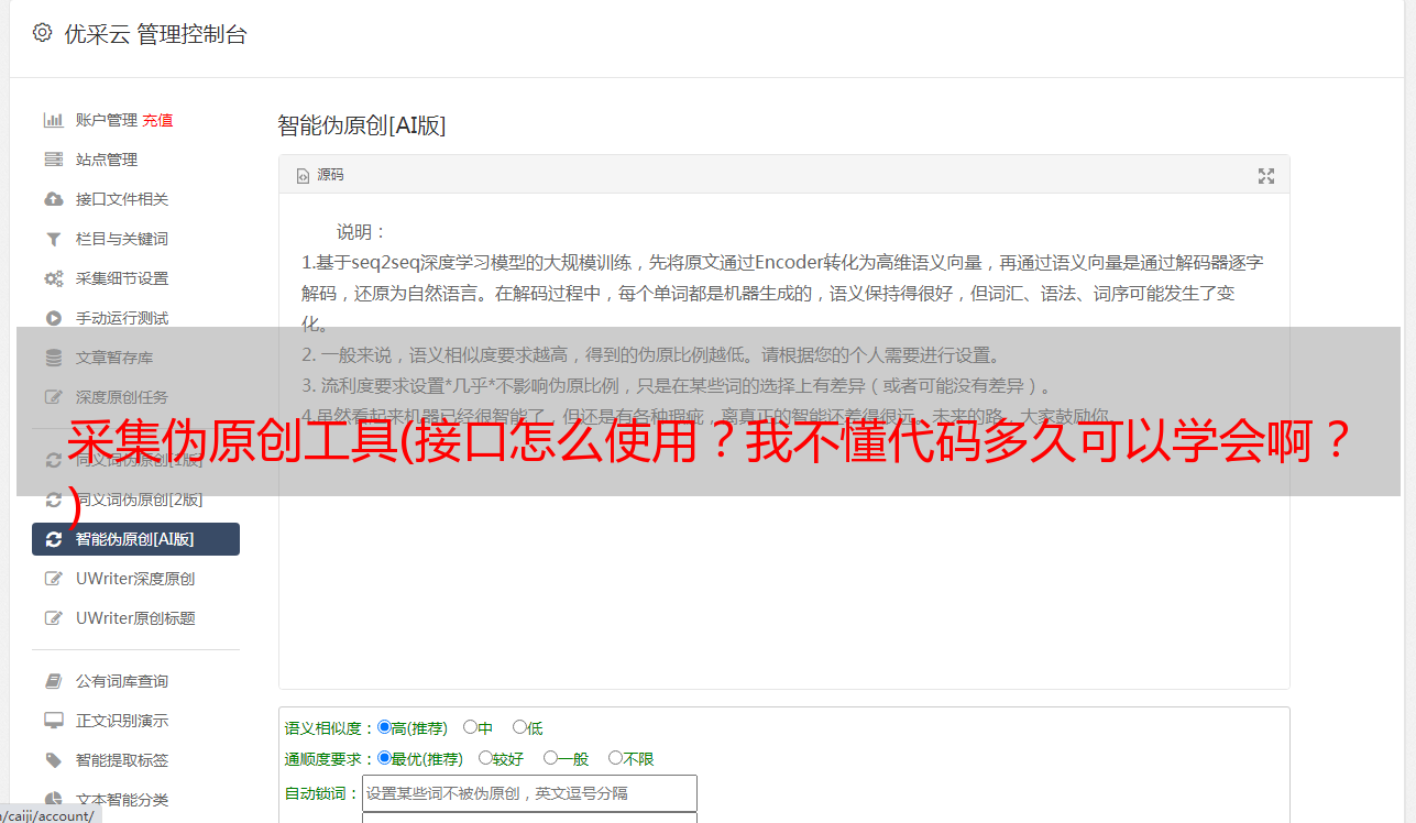 采集伪原创工具(接口怎么使用?我不懂代码多久可以学会啊? )