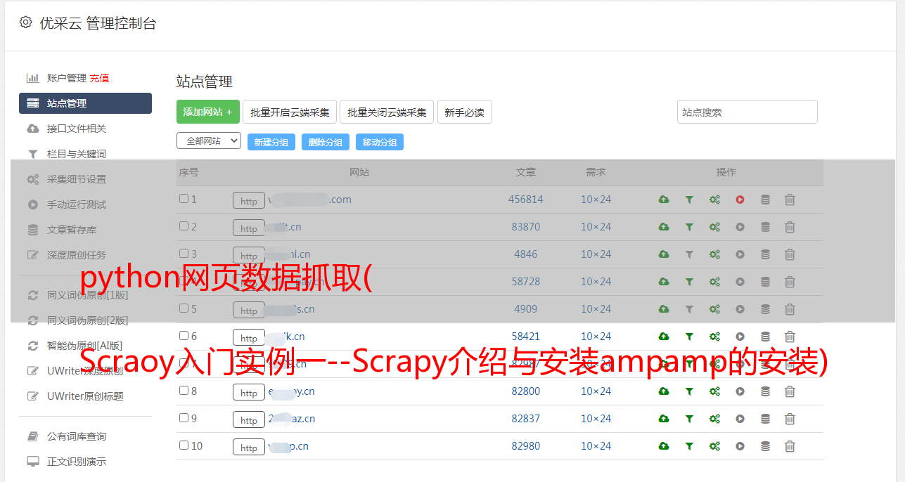 Scrapy 是一个应用程序框架,用于抓取 网站 数据并提取结构化数据。它可以用于一系列程序,包括数据挖掘、信息处理或存储历史数据。它最初是为网页抓取(更准确地说,网页抓取)而设计的,但也可用于获取 API(例如 Amazon Associates Web 服务)或通用网络爬虫返回的数据。