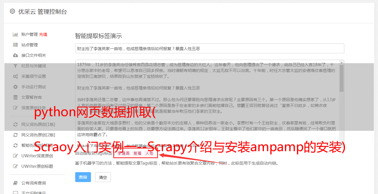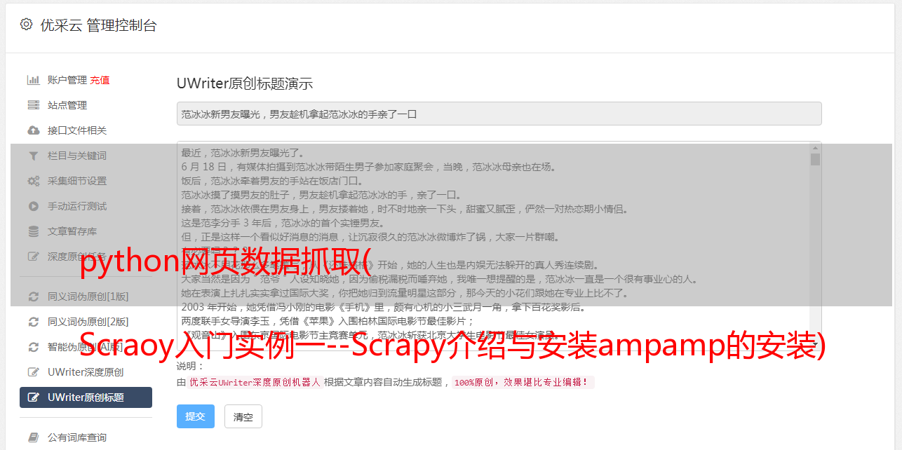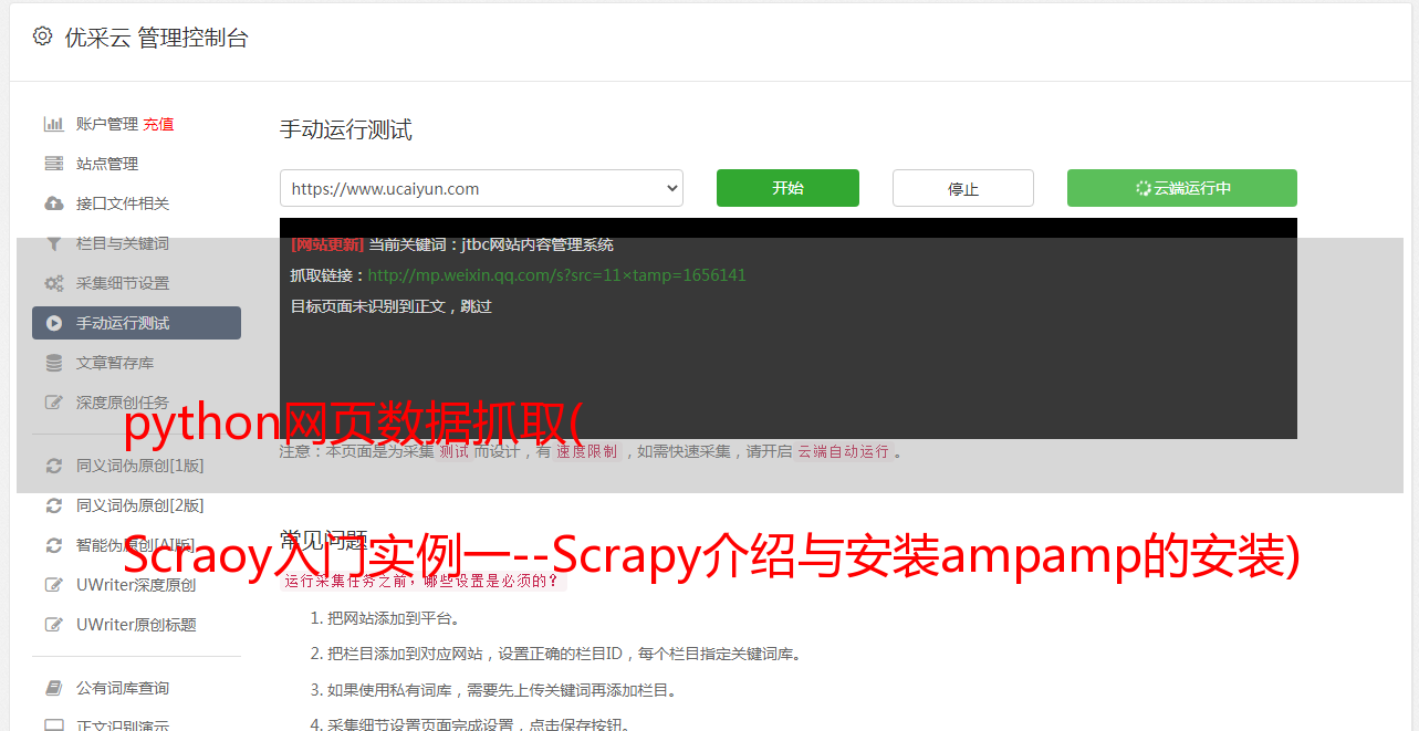至此,使用Scrapy抓取网页内容,并对抓取到的内容进行清理和处理的实验已经完成。要求熟悉并使用此过程中的代码和操作,不要在网上搜索和消化。吸收它并记住它,这是学习知识的真正方法,而不仅仅是画一个勺子。