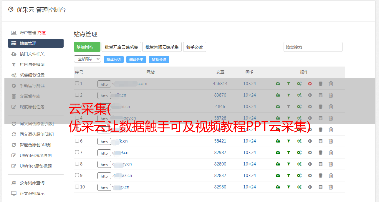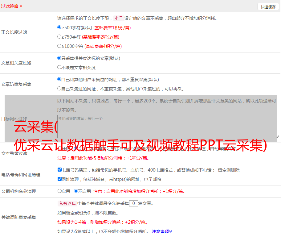 优采云让数据触手可及视频教程PPT云采集一、云采集,时序云采集二、云采集工作原理三、云采集规则,材料编码规则,三大专业,一个程序规则,文献编号规则,乒乓球比赛规则,动词不规则变化表,加速设置教程一、云< @采集,定时云采集Cloud采集是指使用优采云提供的服务器集群工作,处于7*24小时工作状态。客户端完成任务设置并提交至云服务执行云采集后,即可关闭软件、关机、下线采集,真正实现无人值守。另外,云采集 通过云服务器集群的分布式部署方式,多个节点可以同时进行操作,可以提高采集的效率,并且可以有效规避各种网站的IP阻塞策略。云采集的优点:可以关机运行,可以设置定时云采集,加快采集的速度,增加采集@的音量>。一、Cloud采集、Timing Cloud采集1、Cloud采集Setup Startup Cloud采集共有三种方式(立即启动,只运行一次) 2、定时云采集设置定时云采集有两种设置方式3、任务组定时设置可以为任务组设置定时采集二、云采集作品云采集作品1 多个节点可以同时进行操作,可以提高采集的效率,并且可以有效的避免各种网站的IP阻塞策略。云采集的优点:可以关机运行,可以设置定时云采集,加快采集的速度,增加采集@的音量>。一、Cloud采集、Timing Cloud采集1、Cloud采集Setup Startup Cloud采集共有三种方式(立即启动,只运行一次) 2、定时云采集设置定时云采集有两种设置方式3、任务组定时设置可以为任务组设置定时采集二、云采集作品云采集作品1 多个节点可以同时进行操作,可以提高采集的效率,并且可以有效的避免各种网站的IP阻塞策略。云采集的优点:可以关机运行,可以设置定时云采集,加快采集的速度,增加采集@的音量>。一、Cloud采集、Timing Cloud采集1、Cloud采集Setup Startup Cloud采集共有三种方式(立即启动,只运行一次) 2、定时云采集设置定时云采集有两种设置方式3、任务组定时设置可以为任务组设置定时采集二、云采集作品云采集作品1 可以提高采集的效率,有效规避各种网站的IP屏蔽策略。云采集的优点:可以关机运行,可以设置定时云采集,加快采集的速度,增加采集@的音量>。一、Cloud采集、Timing Cloud采集1、Cloud采集Setup Startup Cloud采集共有三种方式(立即启动,只运行一次) 2、定时云采集设置定时云采集有两种设置方式3、任务组定时设置可以为任务组设置定时采集二、云采集作品云采集作品1 可以提高采集的效率,有效规避各种网站的IP屏蔽策略。云采集的优点:可以关机运行,可以设置定时云采集,加快采集的速度,增加采集@的音量>。一、Cloud采集、Timing Cloud采集1、Cloud采集Setup Startup Cloud采集共有三种方式(立即启动,只运行一次) 2、定时云采集设置定时云采集有两种设置方式3、任务组定时设置可以为任务组设置定时采集二、云采集作品云采集作品1 可以关机运行,可以设置定时云采集,加快采集的速度,增加采集的音量。一、Cloud采集、Timing Cloud采集1、Cloud采集Setup Startup Cloud采集共有三种方式(立即启动,只运行一次) 2、定时云采集设置定时云采集有两种设置方式3、任务组定时设置可以为任务组设置定时采集二、云采集作品云采集作品1 可以关机运行,可以设置定时云采集,加快采集的速度,增加采集的音量。一、Cloud采集、Timing Cloud采集1、Cloud采集Setup Startup Cloud采集共有三种方式(立即启动,只运行一次) 2、定时云采集设置定时云采集有两种设置方式3、任务组定时设置可以为任务组设置定时采集二、云采集作品云采集作品1