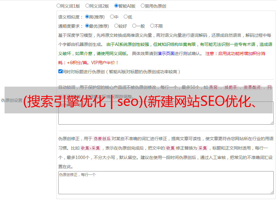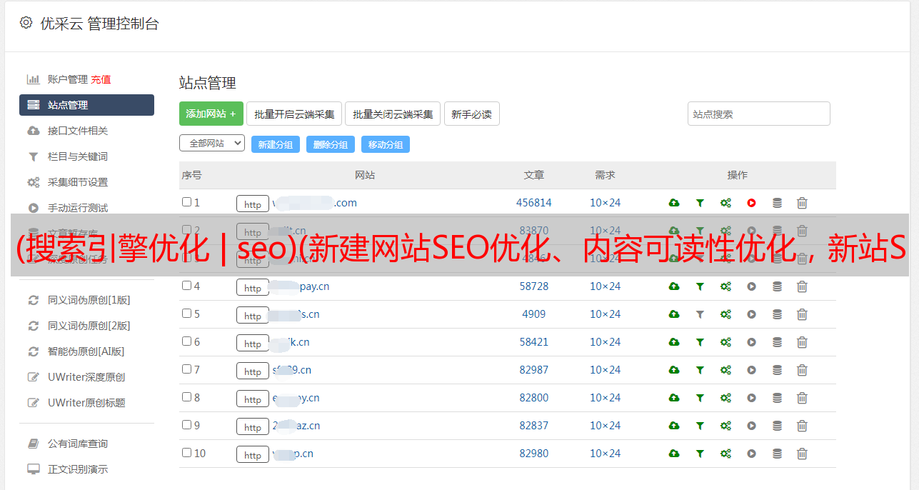 新站SEO软件有全网采集,在线翻译和本地伪原创,支持各种cms全平台发布,新站SEO软件有各种优化功能,无论是来自原创@ >degree 或 from 关键词density,两者都可以配置。新站SEO软件支持全程可视化操作,无需了解配置规则即可完成点击配置。(如图)
