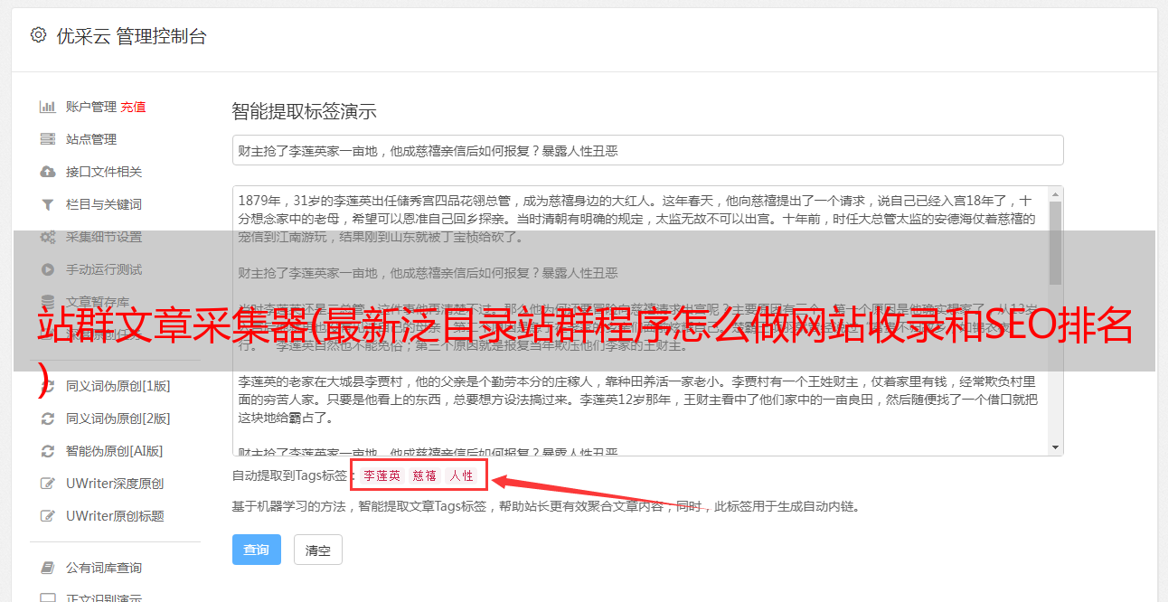 选择pan目录站群程序后,需要准备大量的行业关键词或长尾关键词。pan目录程序通常提供句子库、文章库、标题库,有的还提供网站name头库。通过这些行业关键词或者长尾关键词,关键词pan采集在全网进行,再结合伪原创发布。因为来自采集的内容是优质新闻源,内容质量极好,采集伪原创后,内容就是搜索引擎想到的原创 . 收录 等搜索引擎对用户有价值的内容。