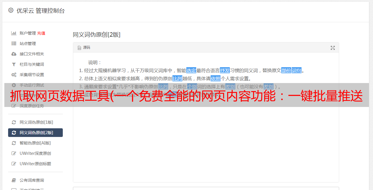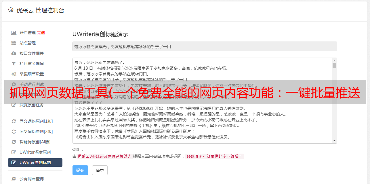 网页内容抓取,什么是网站内容抓取?就是一键批量抓取网站的内容。只需要输入域名即可抓取网站的内容。今天给大家分享一个免费的全能网页内容抓取功能:一键抓取网站内容+自动伪原创+主动推送到搜索引擎收录(参考图片详情一、二、三、四、五)@ >