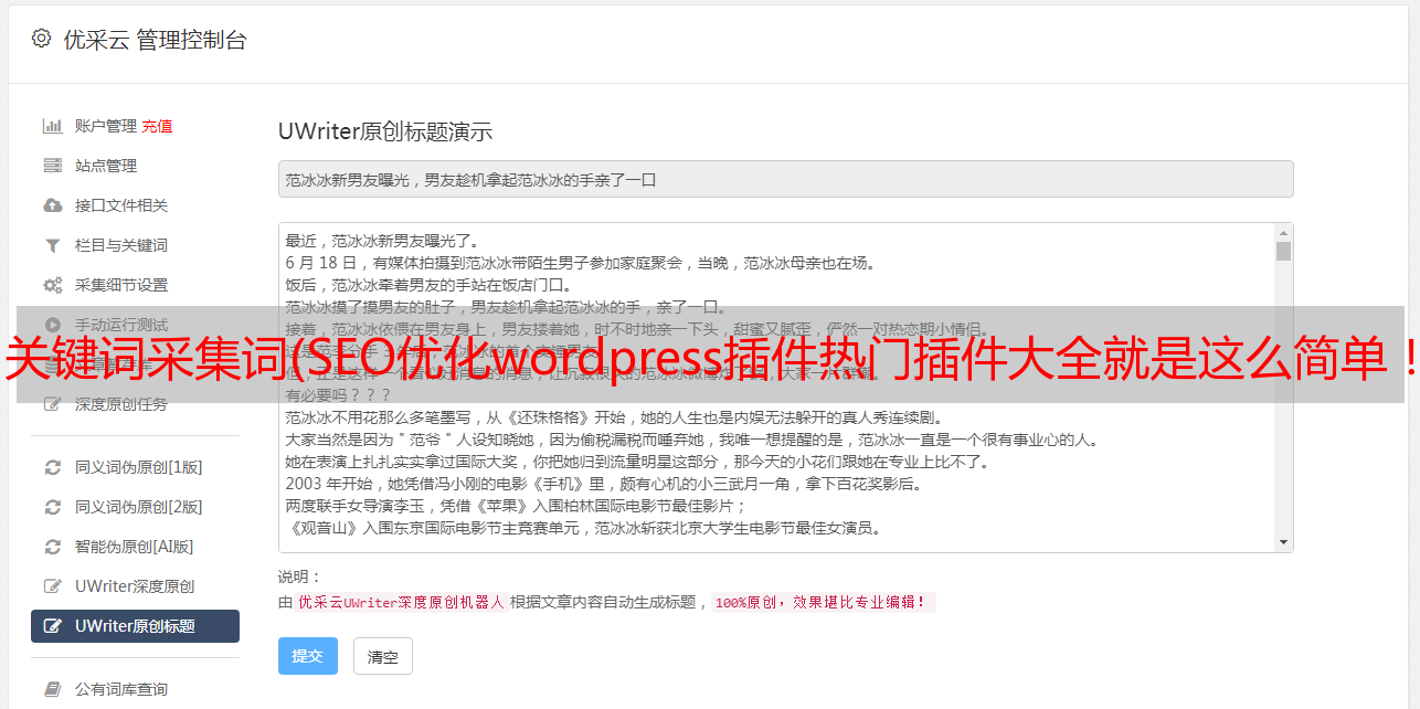 wordpress采集插件,wp站长都知道wordpress本身不提供文章采集伪原创发布功能,需要用到wordpress采集插件使用很多长尾的文章采集伪原创@关键词做全网文章关键词pan采集,然后需要注意即虽然wordpress采集插件数据源丰富,文章不用担心内容质量的来源,但是来自这些数据源的文章采集需要由伪原创文章供搜索引擎处理,再结合文章聚合+Tag标签聚合,最后释放文章。