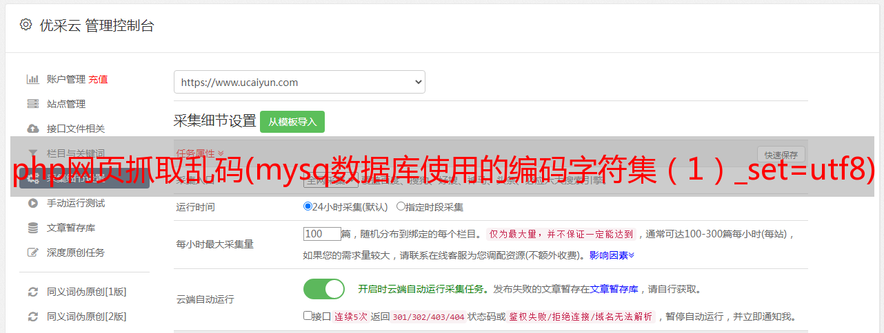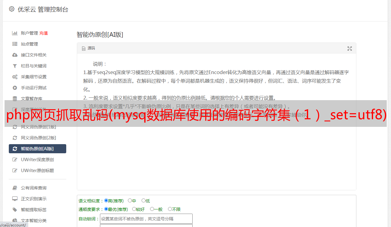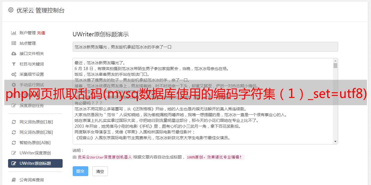 优采云 发布时间: 2022-04-19 16:39php网页抓取乱码(mysq数据库使用的编码字符集(1)_set=utf8)