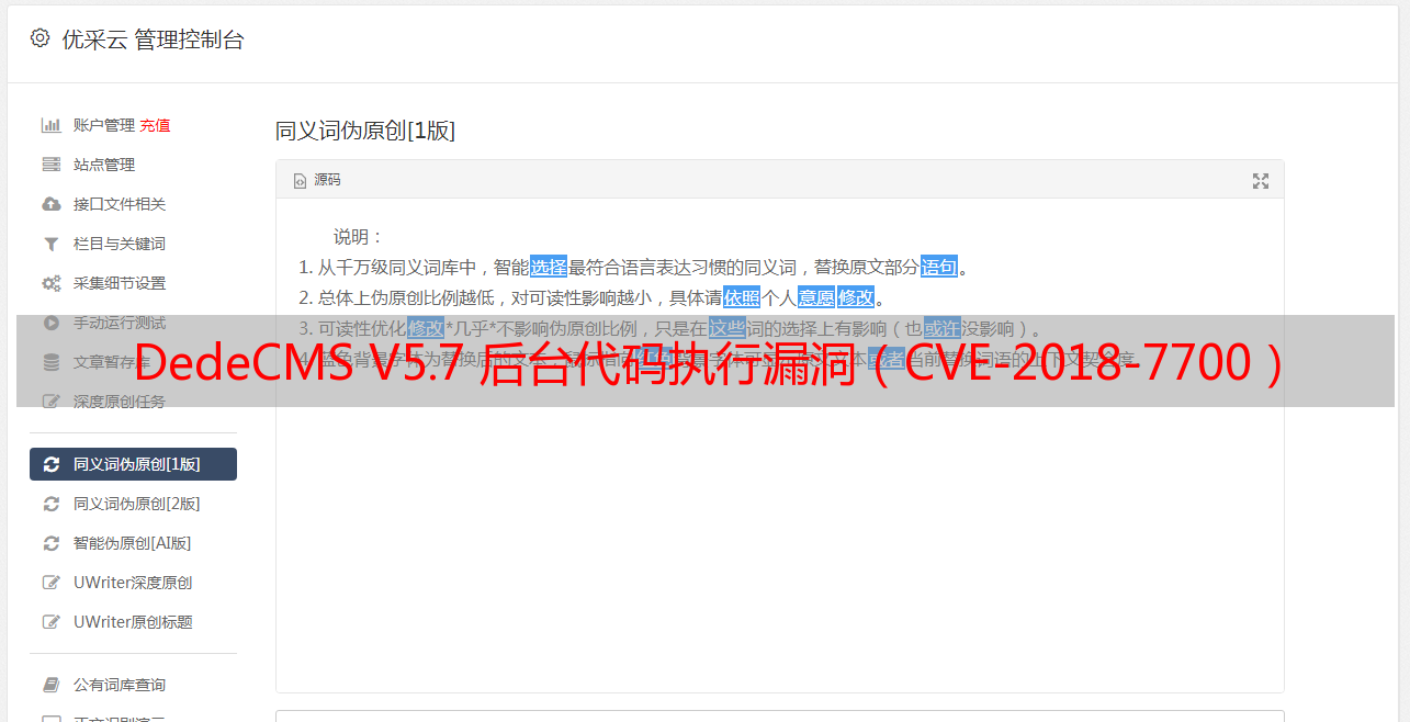 优采云 发布时间: 2022-04-22 07:53DedeCMS V5.7 后台代码执行漏洞(CVE-2018-7700)