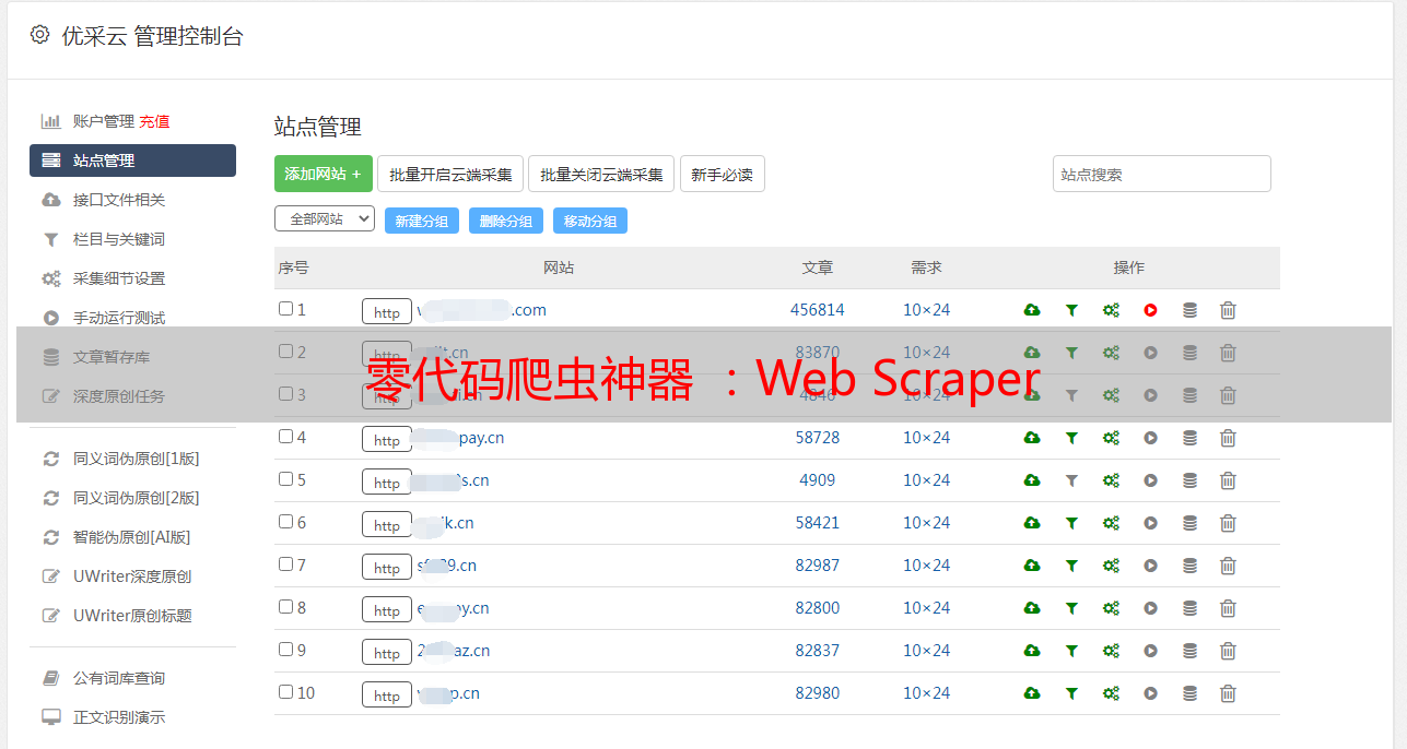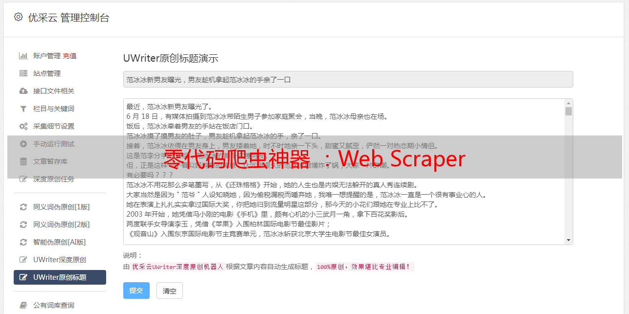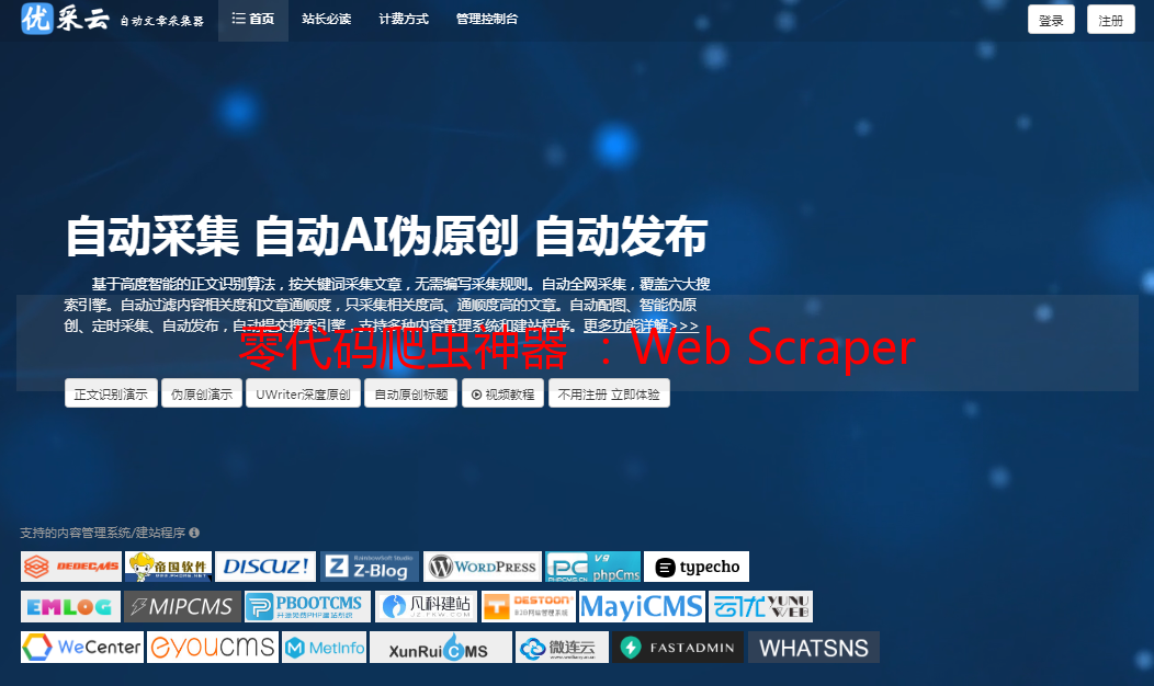 目前市面上已经有一些比较成熟的零代码爬虫工具,比如说优采云,有现成的模板可以使用,同时也可以自己定义一些抓取规则。但我今天要介绍的是另外一个神器 -- Web Scraper,它是 Chrome 浏览器的一个扩展插件,安装后你可以直接在F12调试工具里使用它。