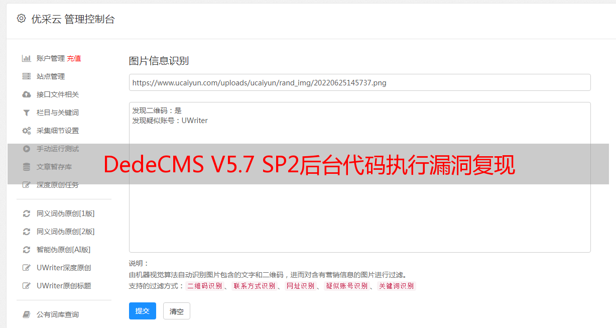 优采云 发布时间: 2022-04-30 04:26DedeCMS V5.7 SP2后台代码执行漏洞复现