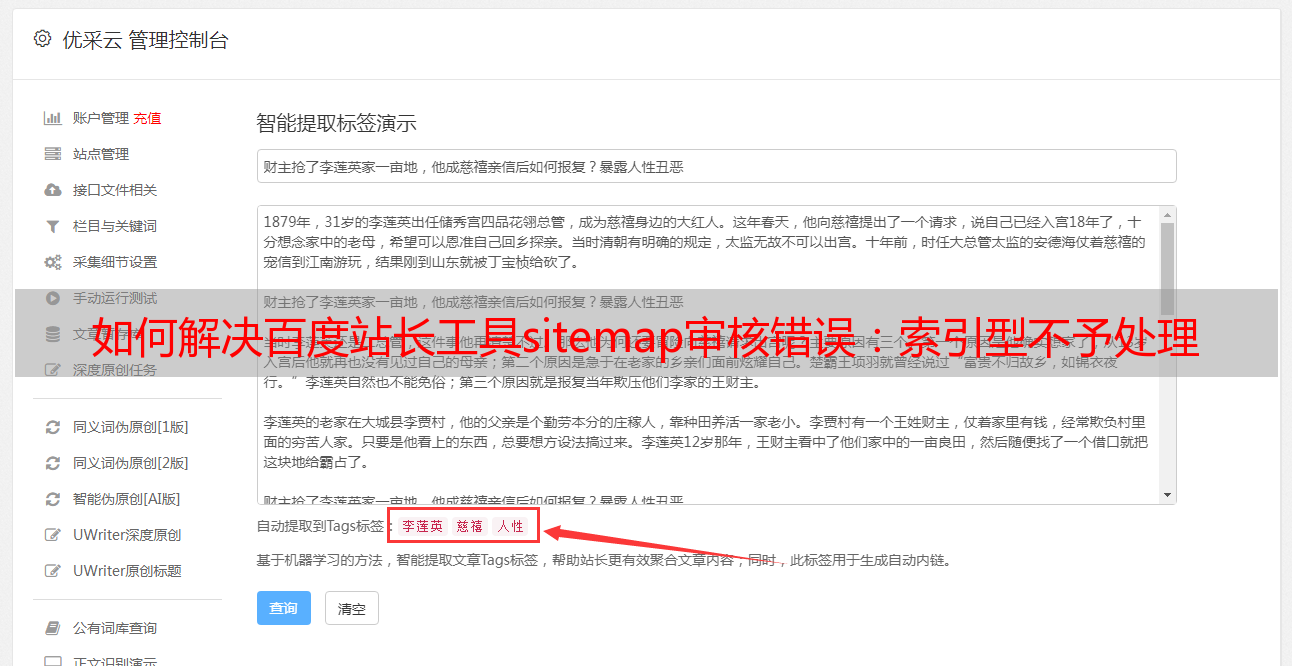 优采云 发布时间: 2022-04-30 05:08如何解决百度站长工具sitemap审核错误:索引型不予处理