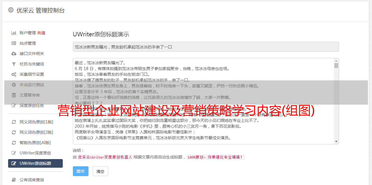 网站程序开发人员需要数据库编程,例如SQL语言编程,Web编程,ASPJSPPHP等。 4. 网站内容编辑器网站内容编辑在网站项目总监的领导下,在网站开发阶段与网页图形设计师和网站程序开发人员进行协调。 网站根据车站的规划设计工作网站所需内容主要负责网站内容的采集和分类网站内容的上载网站 软文编译和其他工作另外网站内容编辑器是网站后续操作的主要力量网站内容编辑器的工作在企业价值中发挥着核心作用网站 网站操作是长期的工作643企业网站的构建过程1. 网站计划2. 网站技术生产和内容准备3. 网站测试4.建立网站服务器以访问Internet 5.申请域名6。发行是经营65家公司的营销建设企业。网站 网站这是网络营销的一个非常重要的组成部分。网站建设是为了满足网络营销的需求。这一点必须清楚网站构造应该同时强调设计和应用。它不仅应注意企业形象的展示,而且应明确网站的网络营销服务功能和流程。注意产品或服务的显示,用户交互,信息检索,客户体验和其他链接的构建,以使网站更加实用和有效,因此应考虑在企业网站自身的营销中做好工作651企业网站优化1.优化设计网站的三层含义优化的预期结果是,第一个用户可以轻松浏览网站的信息并使用网站的服务。搜索引擎可以更平滑地索引第二个Web内容。当用户搜索相关网页时,相关内容可以在引擎搜索过程中显示在理想位置,并为用户提供有吸引力的摘要信息,以便用户可以发现相关信息并引起兴趣,然后通过搜索结果指南输入网站以获取详细信息运营商可以轻松管理和维护网站,这对于各种在线营销方法的应用很有帮助。为用户优化了三级优化含义的详细说明。以用户需求为导向,设计方便。 网站导航网页的下载速度尽可能快。网页布局可能合理并且适合保存,打印和转发。 网站信息丰富,可有效帮助用户建立信任。对于包括搜索引擎优化站在内的网络环境,搜索引擎友好,易于网络营销的积累网站在类似网站的可靠性之间易于建立资源等。网站运营和维护优化点反映了网络营销的功能网站,以便可以使用各种网络营销方法以发挥最大的作用。网站便于日常信息更新,维护,修订和升级,并且方便获取和管理注册用户资源等。2。 网站优化设计的原理网站优化不仅是搜索引擎优化应坚持以用户为导向,而不是坚持以搜索引擎为导向。网站优化的基础是网站 网站内容的结构,功能和服务尤其基于网站结构,网站内容优化是最重要的。 652 网站增加访问量的策略。由于网站访问是他的生命和价值,因此可以采取以下几点措施来增加网站的访问量:1.从网站本身做1美丽而令人愉悦的界面2随时更新信息以方便搜索引擎或查找其他方式3个性化信息是最有价值的内容4 网站快速5交互式内容2。1.从搜索引擎导航网站登录2.在主要的搜索引擎中注册3.通过以下方式进行操作促销1.参与各种广告交换组织2.交换链接3. 网站广告4.电子邮件促销方法5.其他促销方法4.建立在线声誉并通过符合以下要求的宣传策略来进行口碑传播网站的特征。简而言之,增加访问次数并不是在1天和2天之内可以实现的最重要的事情。这是您网站内容的质量。 网站最好的宣传方法是口口相传