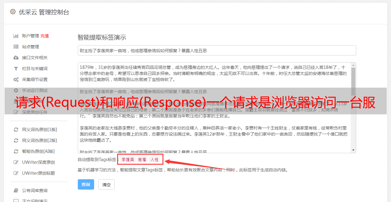 优采云 发布时间: 2021-05-18 20:16请求(Request)和响应(Response)一个请求是浏览器访问一台服务器