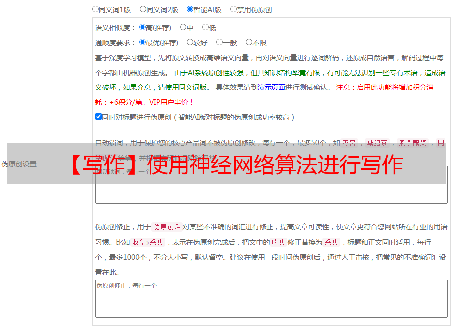 媒帮派伪原创工具基于人工智能(AI)大数据深度伪原创算法,使用神经网络算法,在超过1,535,000篇文章中进行自动学习、聚合算法进行人工智能编写,既不更改内容的语义