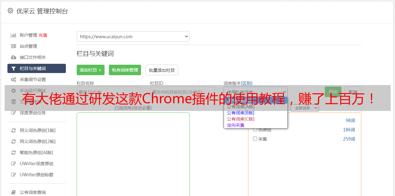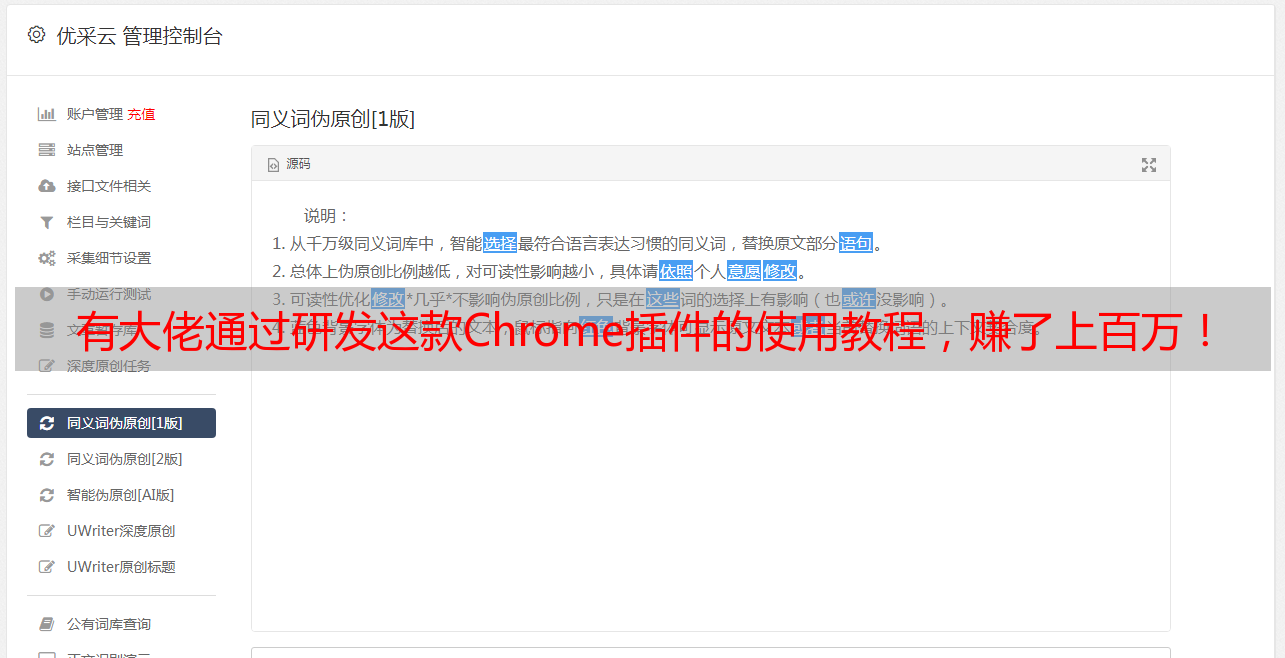 优采云 发布时间: 2022-05-06 04:13有大佬通过研发这款Chrome插件的使用教程,赚了上百万!