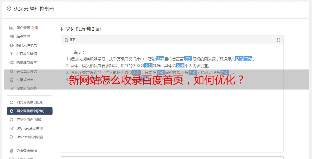 优采云 发布时间: 2022-05-07 13:51新网站怎么收录百度首页,如何优化?