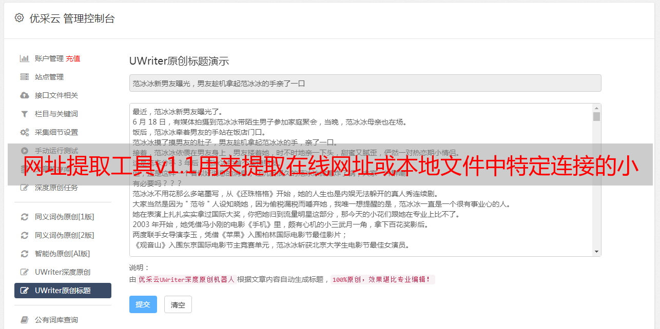 优采云 发布时间: 2022-05-09 05:08网址提取工具v1.1用来提取在线网址或本地文件中特定连接的小软件