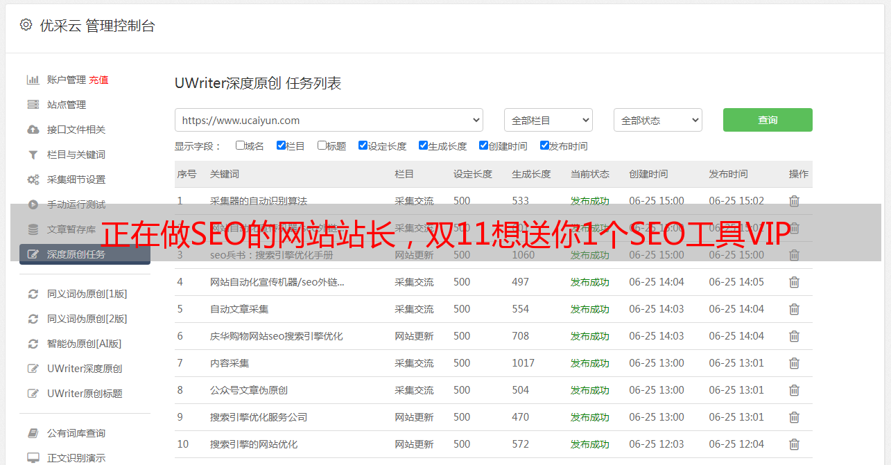 优采云 发布时间: 2022-05-09 22:52正在做SEO的网站站长,双11想送你1个SEO工具VIP