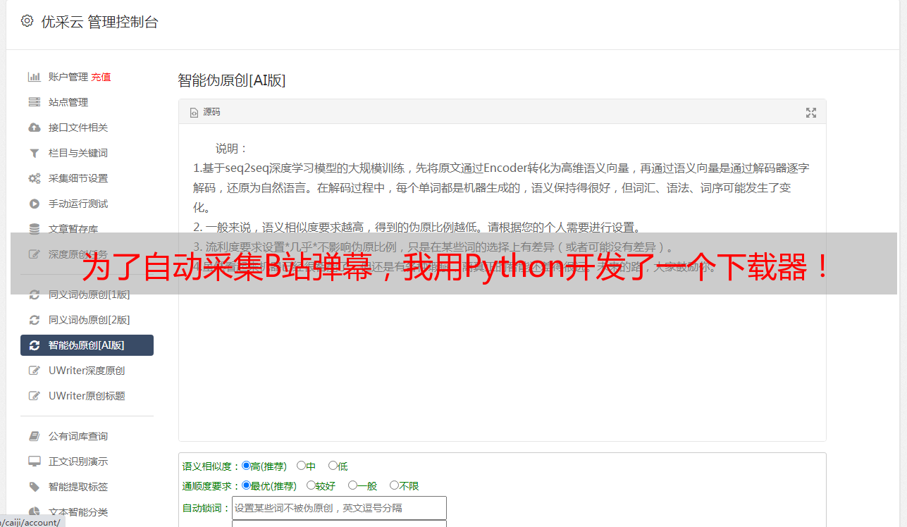 优采云 发布时间: 2022-05-10 12:41为了自动采集B站弹幕,我用Python开发了一个下载器!