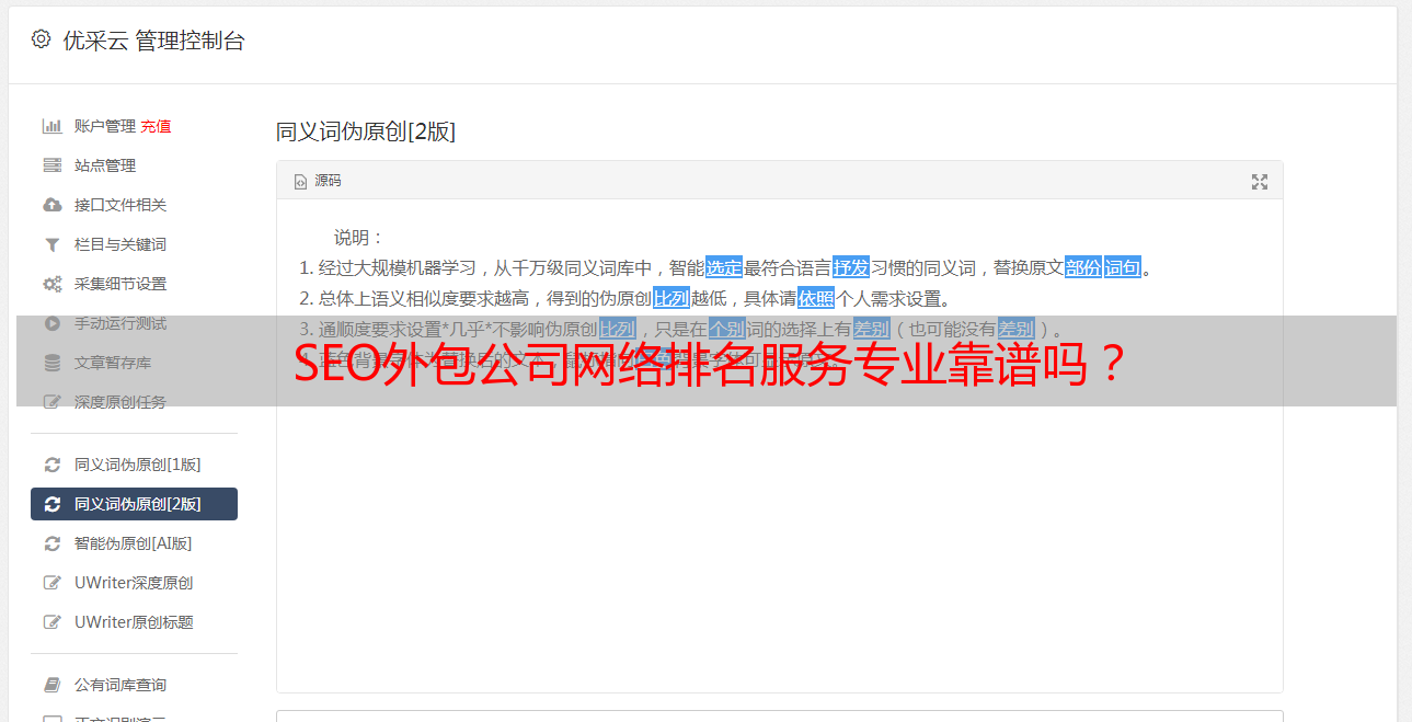 优采云 发布时间: 2022-05-10 12:55SEO外包公司网络排名服务专业靠谱吗?