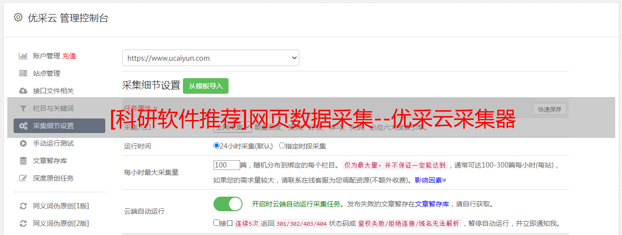 优采云采集器是一款可根据不同网站,提供多种网页采集策略与配套资源,访问网页文档的互联网数据采集器。通过设计工作流程,可以实现采集的程序自动化,以达到快速的对网页数据进行收集整合,完成用户数据采集的目的。