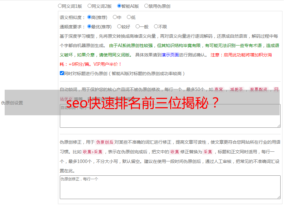 个人不太建议做这种seo快速排名前三位,seo比的就是耐心,精力,内容,不能忘了做seo的初心 。seo对百度来说,就是要给网民创造好的内容。没有seo的创作能力就没有百度,而快速排名完全跟百度背道而驰,制造垃圾伪原创文章,而且跟百度sem竞争排名,减少百度收入,给百度制造垃圾文章,我觉得不会长久;