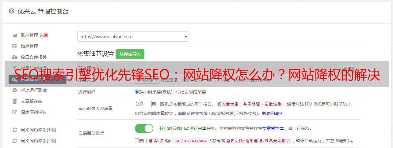 优采云 发布时间: 2022-05-13 23:16SEO搜索引擎优化先锋SEO:网站降权怎么办?网站降权的解决办法
