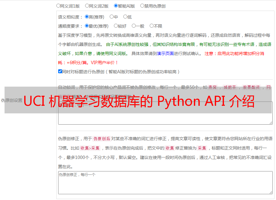 优采云 发布时间: 2022-05-14 06:47UCI 机器学习数据库的 Python API 介绍