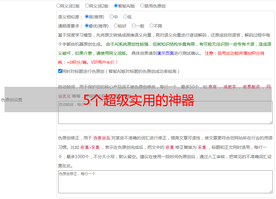 2、采用TF人工智能引擎对文章进行分析,确保能够最大的提高原创度同时又保持可读性。3、利用海量数据计算得出的同义词替换词库,可以在不改变文章语义的前提下生成原创文章。同时每日导入目前主流的同义词库和输入法词库,自动升级,确保文章的新词最大可能能够找到替换词。4、采用深层神经网络算法,自动对段落中的文字顺序进行调节和整句替换,把大量前沿算法用到了伪原创的过程中。5、天辰AI伪原创工具采用三种不同算法,用户可以根据当前内容,选中不同改写方案,达到不同效果。