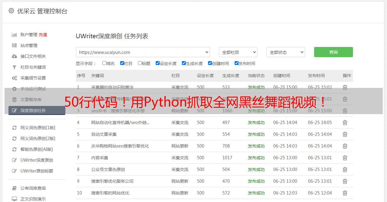 优采云 发布时间: 2022-06-17 02:1550行代码!用Python抓取全网黑丝舞蹈视频!
