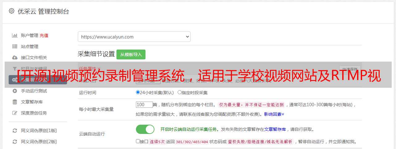 优采云 发布时间: 2022-06-17 12:36[开源]视频预约录制管理系统,适用于学校视频网站及RTMP视频推流预约录制