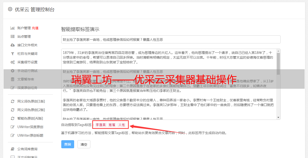 优采云数据采集系统以完全自主研发的分布式云计算平台为核心,可以在很短的时间内,轻松从各种不同的网站或者网页获取大量的规范化数据,帮助任何需要从网页获取信息的客户实现数据自动化采集,编辑,规范化,摆脱对人工搜索及收集数据的依赖,从而降低获取信息的成本,提高效率。下面让我们一起来学习优采云采集器的五个基本操作吧!