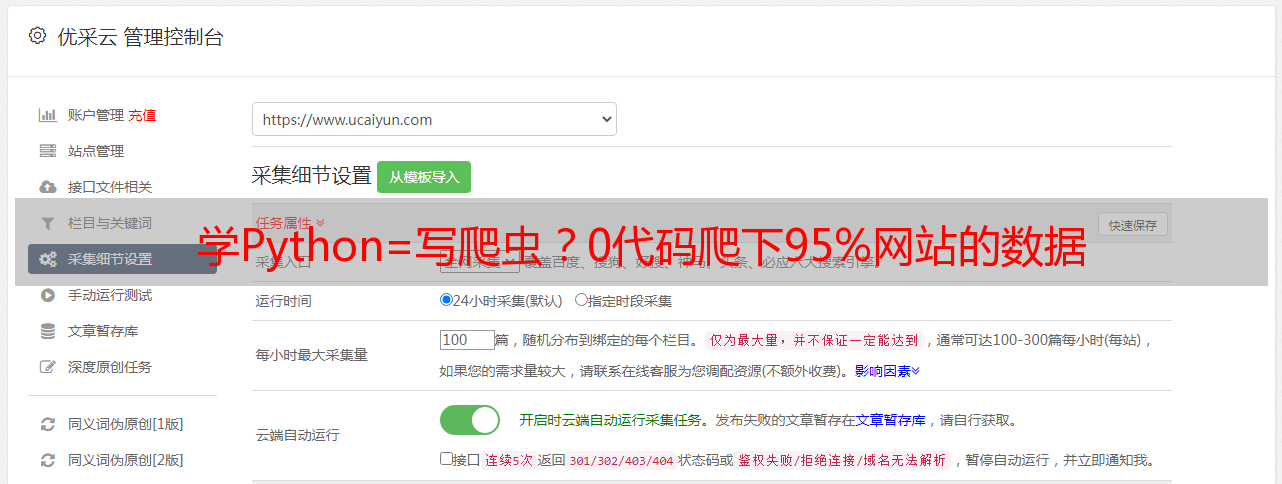优采云 发布时间: 2022-06-18 02:23学Python=写爬虫?0代码爬下95%网站的数据