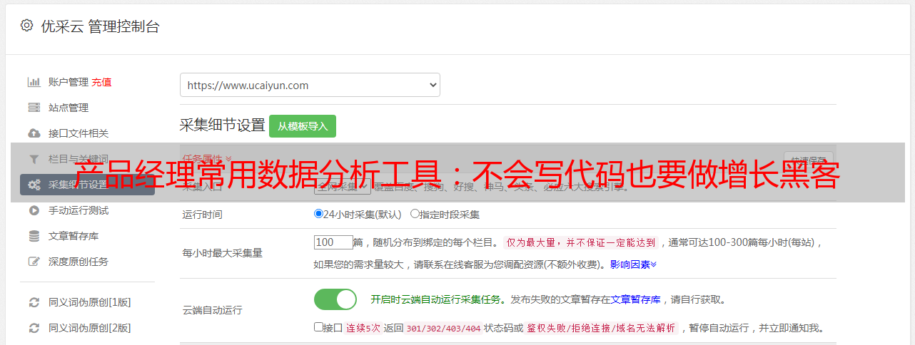 功能介绍:除了企业内部运营数据,产品经理还需要经常关注竞品的信息,推荐使用优采云工具。优采云完全可视化操作,不需要写代码,简单配置即可抓取网页上的数据。模拟点击操作,翻页,甚至识别验证码都可以轻松搞定。