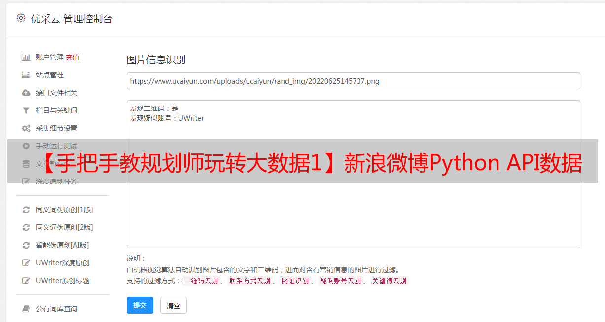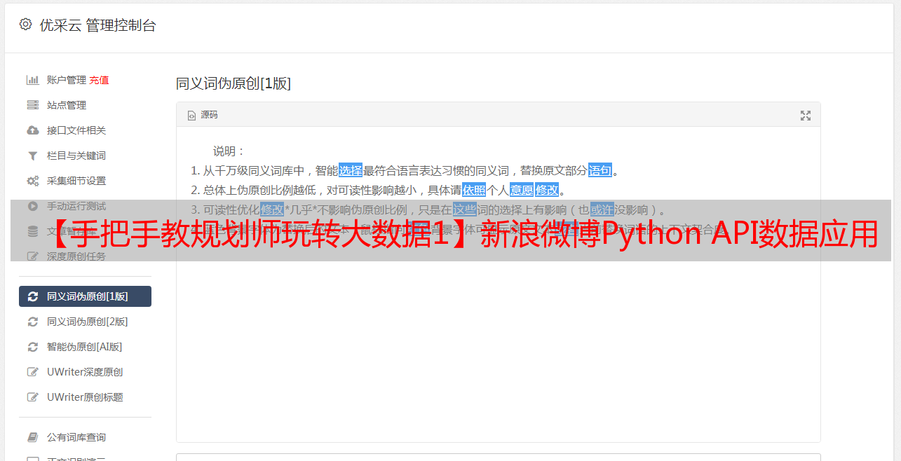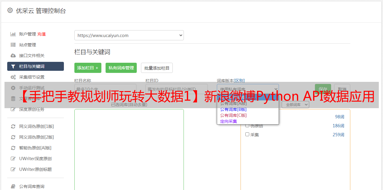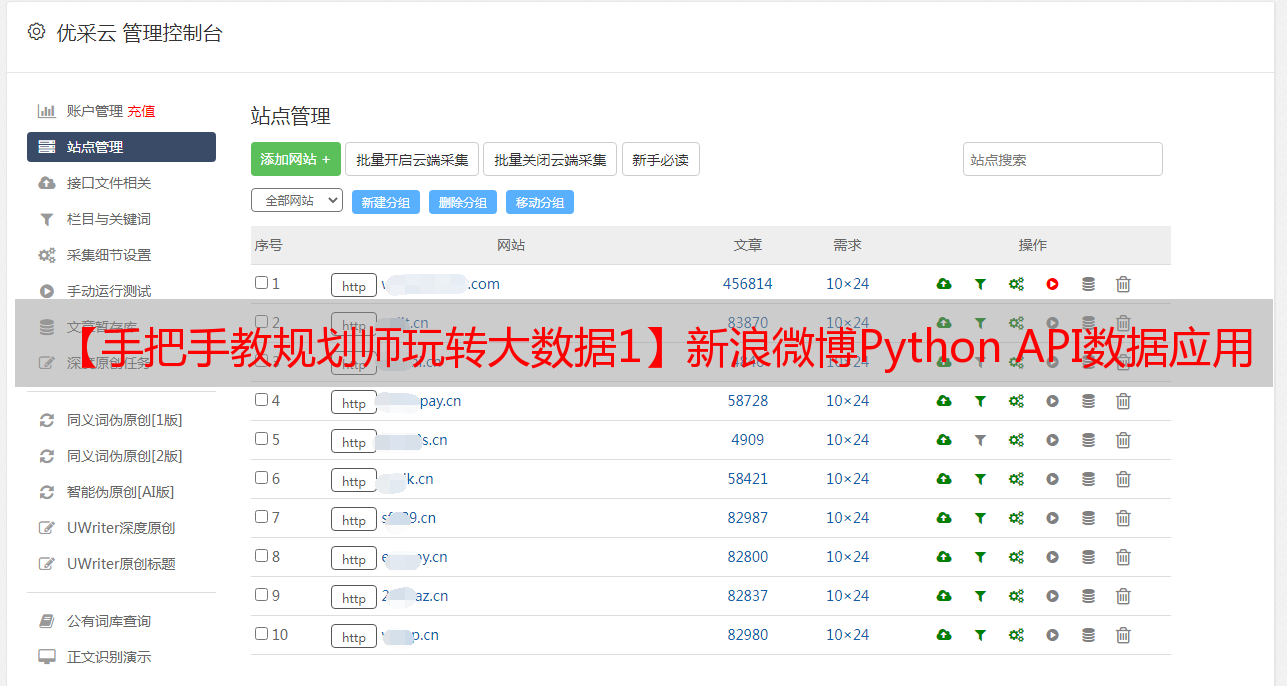 优采云 发布时间: 2022-06-22 11:19【*敏*感*词*教规划师玩转大数据1】新浪微博Python API数据应用简明教程