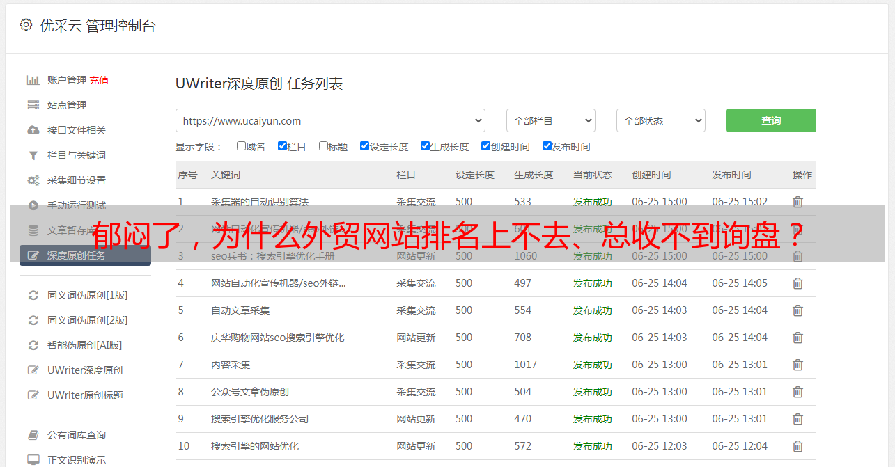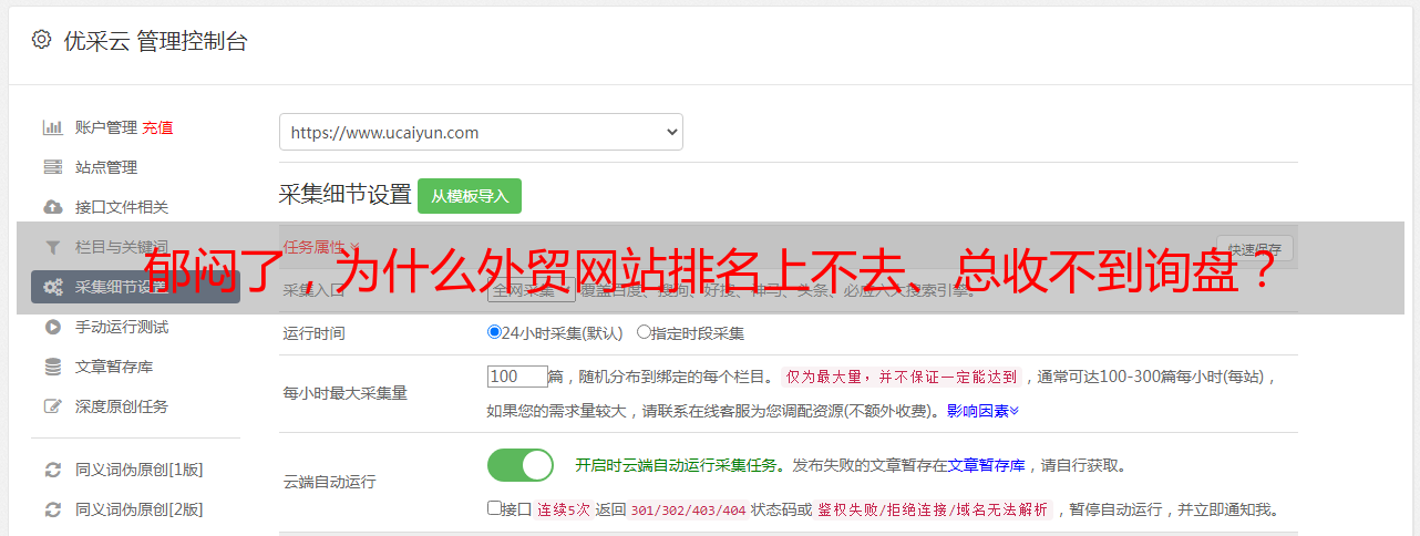 优采云 发布时间: 2022-06-24 01:29郁闷了,为什么外贸网站排名上不去、总收不到询盘?